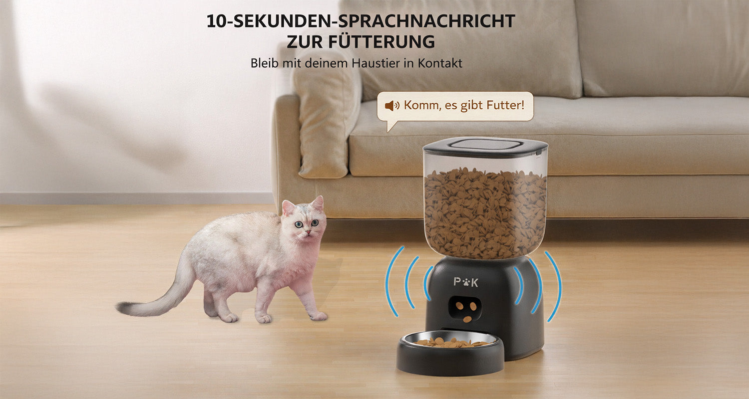 Der 3L Futterautomat ermöglicht eine einfache Programmierung von 1–4 Mahlzeiten pro Tag mit individuell einstellbaren Portionen. Dank der integrierten 10-Sekunden-Sprachaufnahme hört dein Liebling deine vertraute Stimme zur Fütterungszeit – für mehr Nähe und weniger Stress. Die duale Stromversorgung (Batterie oder USB) sorgt für maximale Flexibilität und eine Batterielaufzeit von bis zu 180 Tagen.