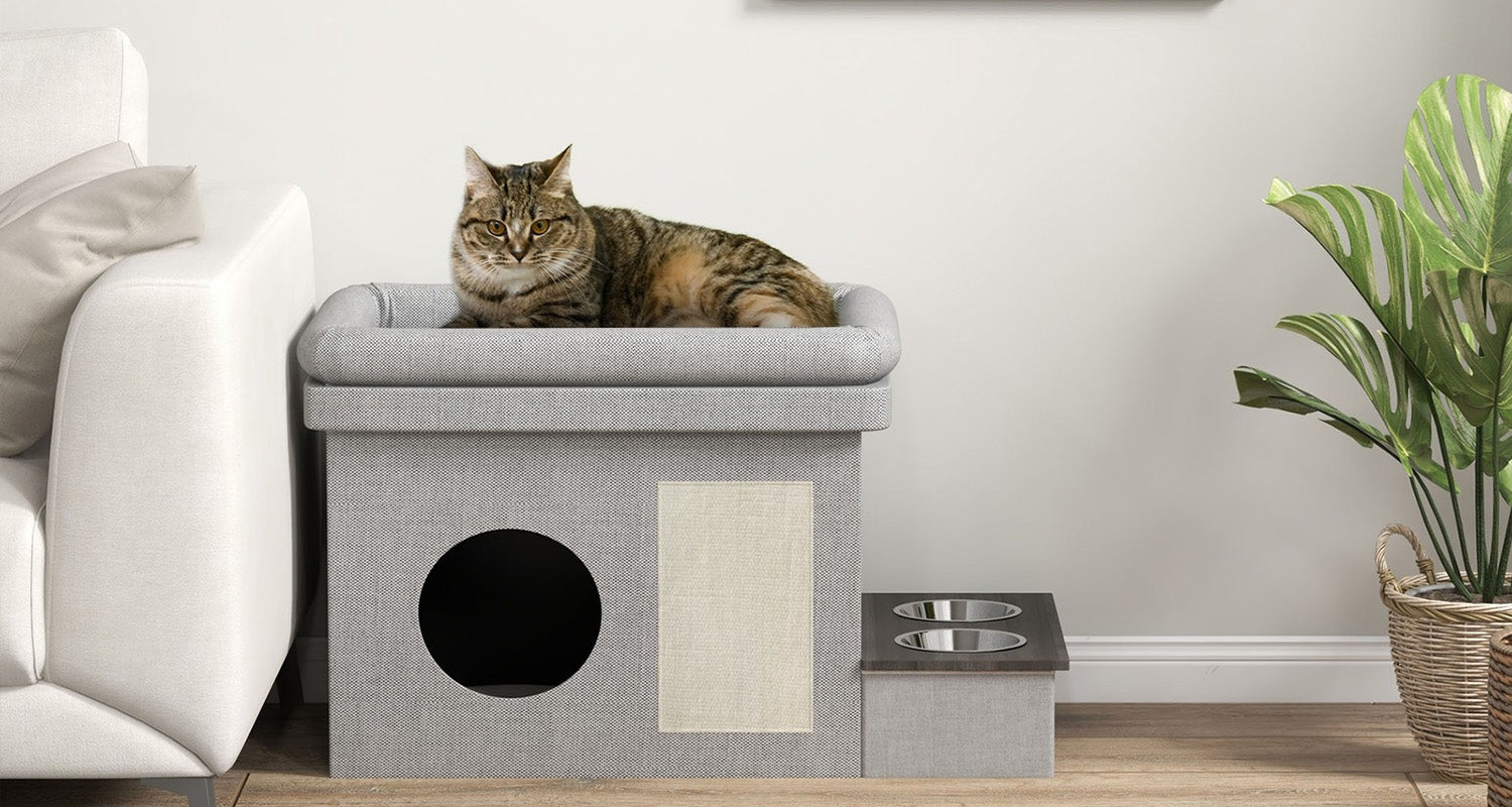 Das gemütliche Katzenhaus bietet deinem Vierbeiner einen einladenden Rückzugsort und gleichzeitig eine praktische Futterstation. Durch das stilvolle, grau bezogene Design fügt sich das Katzenhaus harmonisch in jede Wohnumgebung ein. Die robuste Konstruktion aus Holz und hochwertigem Polyester sorgt für Stabilität und Komfort – ideal zum Entspannen, Dösen oder Schlafen. Zusätzlich verfügt das Katzenhaus über zwei integrierte Edelstahlnäpfe für Futter und Wasser, die sich leicht herausnehmen lassen, sowie ein weiches Kissen im Inneren für extra Gemütlichkeit.